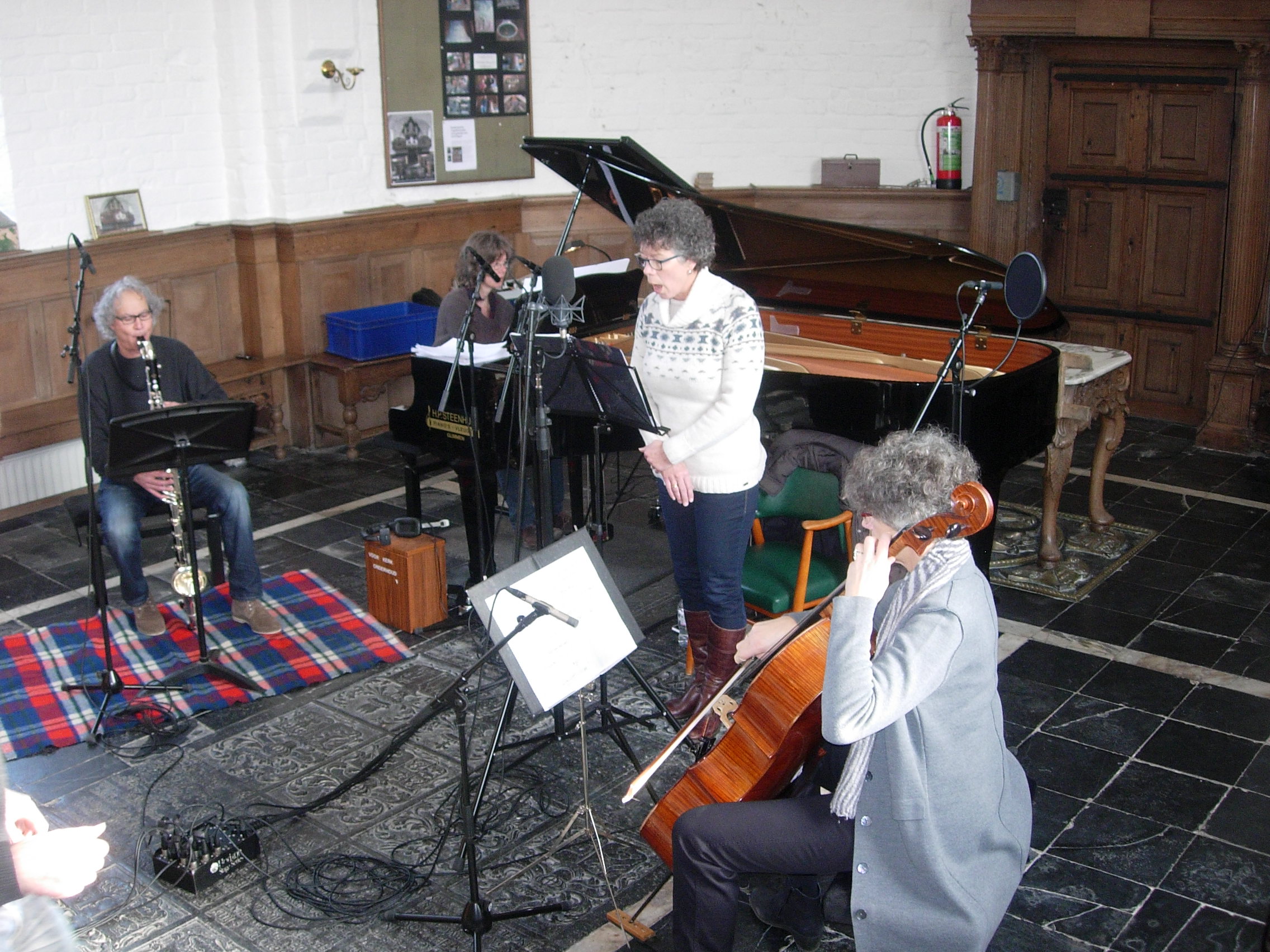 De musici Netty Otter, Pierre Lafay, Wilma van der Wardt en Ellen Dijkhuizen waren meteen gecharmeerd van de prachtige akoestiek van deze historische oude kerk in het Groningse Zandeweer.
